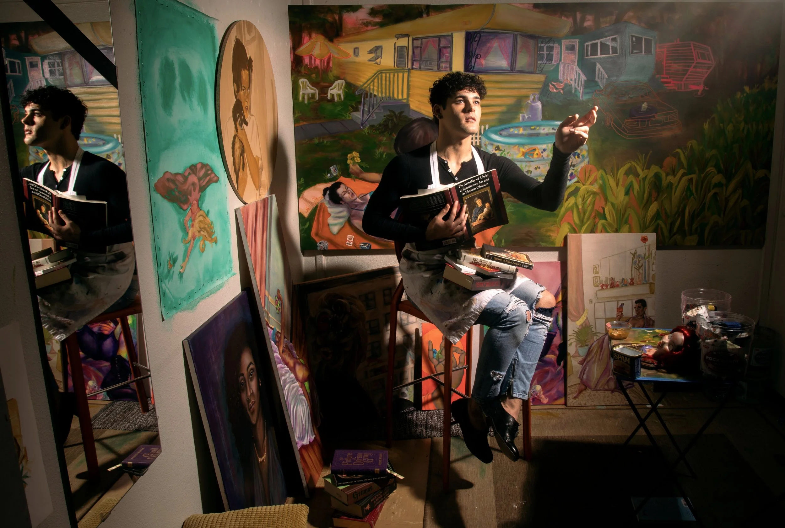 I am drawn to stories entrusted to us by past generations, familial, societal and the like. The role folklore, fairytales, and myths play in society’s understanding of the family dynamic inspires my practice. Working primarily in painting and drawing I reimagine these stories by mining family history and photographs to depict opulent fantasies rendered in synthetic colors. My work provokes unease by combining fantastical color schemes with images of family dysfunction interrupting the romanticized perspective on the American domestic sphere. With vibrant hues of polyester pinks, magentas, electric blues, and neon yellows I produce scenes at the fringe of memory and fantasy.